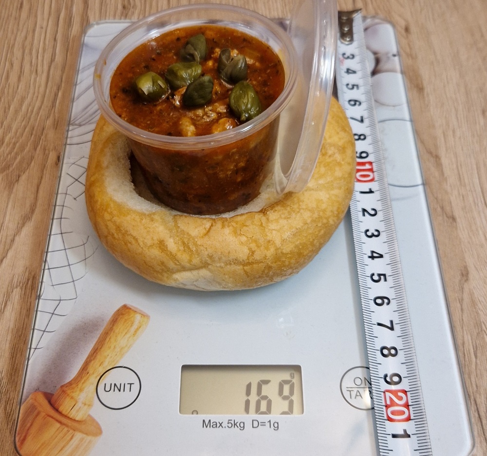 Bułka/talerz z patelni do wypełnienia gotowym farszem mięsno-warzywnym (mięso mielone wieprzowe), kaparami, sosem o smaku śródziemnomorskim.
