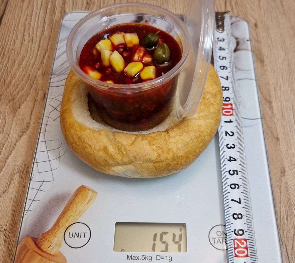 Bułka/talerz z patelni do wypełnienia gotowym farszem mięsno-warzywnym (mięso mielone wieprzowe), kukurydzą, jalapeño, sosem o smaku meksykańskim.
