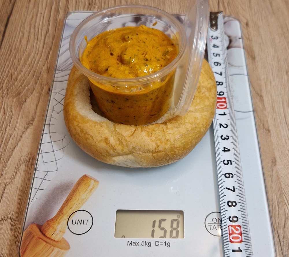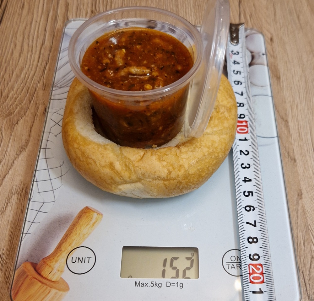 Bułka/talerz z patelni do wypełnienia gotowym farszem mięsno-warzywnym (mięso mielone wieprzowe) sosem o smaku orientalnym.